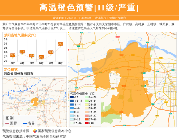 荥阳市气象台2022年08月12日08时25分发布高温橙色预警信号:预计今天白天荥阳市市区、广武镇、高村乡、王村镇、城关乡、豫龙镇等全部乡镇、街道最高气温将升至37℃以上,请注意防范高温天气带来的不利影响。 信息来源:国家预警信息发布中心; 发布单位:荥阳市气象台。