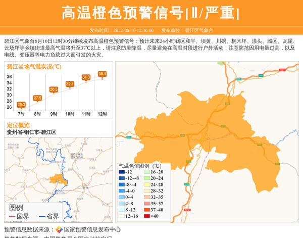 碧江区气象台8月10日12时30分继续发布高温橙色预警信号:预计未来24小时我区和平、坝黄、川硐、桐木坪、漾头、城区、瓦屋、云场坪等乡镇街道最高气温将升至37℃以上,请注意防暑降温,尽量避免在高温时段进行户外活动,注意防范因用电量过高,以及电线、变压器等电力负载过大而引发的火灾。 信息来源:国家预警信息发布中心; 发布单位:碧江区气象台。
