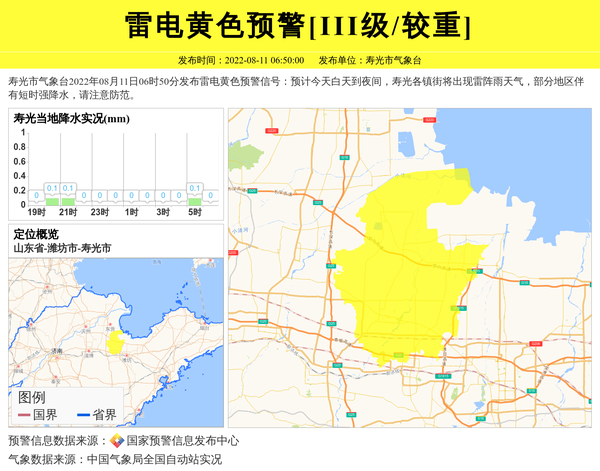 寿光市气象台2022年08月11日06时50分发布雷电黄色预警信号:预计今天白天到夜间,寿光各镇街将出现雷阵雨天气,部分地区伴有短时强降水,请注意防范。 信息来源:国家预警信息发布中心; 发布单位:寿光市气象台。