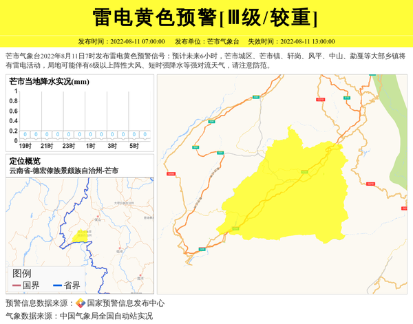 芒市气象台2022年8月11日7时发布雷电黄色预警信号:预计未来6小时,芒市城区、芒市镇、轩岗、风平、中山、勐戛等大部乡镇将有雷电活动,局地可能伴有6级以上阵性大风、短时强降水等强对流天气,请注意防范。 信息来源:国家预警信息发布中心; 发布单位:芒市气象台。