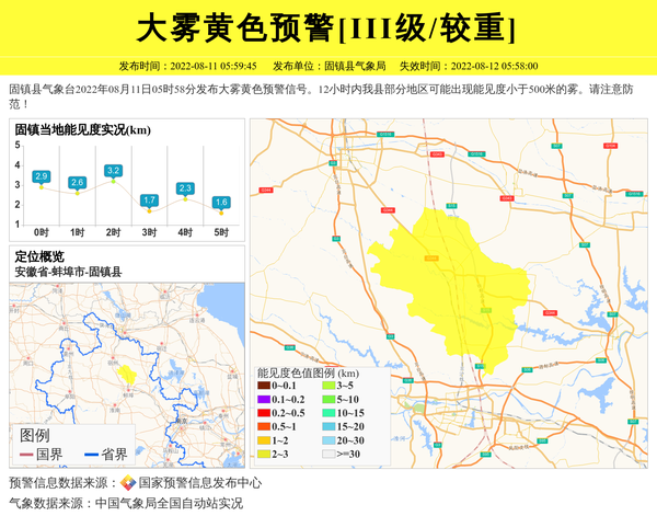 固镇县气象台2022年08月11日05时58分发布大雾黄色预警信号。12小时内我县部分地区可能出现能见度小于500米的雾。请注意防范! 信息来源:国家预警信息发布中心; 发布单位:固镇县气象局。