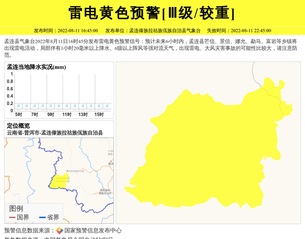 孟连县气象台2022年8月11日16时45分发布雷电黄色预警信号:预计未来6小时内,孟连县芒信、景信、娜允、勐马、富岩等乡镇将出现雷电活动,局部伴有1小时20毫米以上降水、6级以上阵风等强对流天气,出现雷电、大风灾害事故的可能性比较大,请注意防范。 信息来源:国家预警信息发布中心; 发布单位:孟连傣族拉祜族佤族自治县气象台。