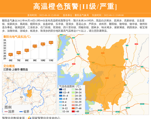 鄱阳县气象台2022年08月10日12时09分发布高温橙色预警信号:预计未来24小时内,我县白沙洲乡、昌洲乡、高家岭镇、古县渡镇、侯家岗乡、凰岗镇、枧田街乡、金盘岭镇、乐丰镇、莲湖乡、莲花山乡、芦田乡、农科所、鄱阳镇、饶埠镇、饶丰镇、饶州街道办事处、饶洲监狱、三庙前乡、石门街镇、双港镇、四十里街镇、田畈街镇、团林乡、响水滩乡、谢家滩镇、鸦鹊湖乡、银宝湖乡、油墩街镇、游城乡、柘港乡、珠湖乡的部分地区最高气温将达37°C以上,请注意防暑降温。 信息来源:国家预警信息发布中心; 发布单位:鄱阳县气象局。