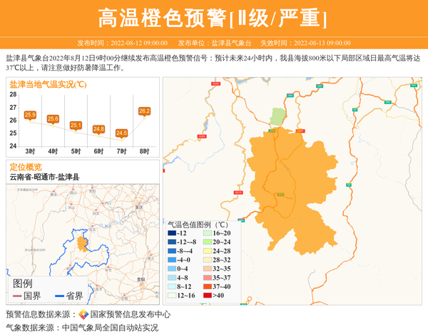 盐津县气象台2022年8月12日9时00分继续发布高温橙色预警信号:预计未来24小时内,我县海拔800米以下局部区域日最高气温将达37℃以上,请注意做好防暑降温工作。 信息来源:国家预警信息发布中心; 发布单位:盐津县气象台。