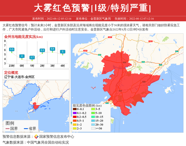 大雾红色预警信号:预计未来2小时,金普新区东部及沿岸海域将出现能见度小于50米的强浓雾天气,请相关部门做好防雾应急工作,广大市民避免户外活动,出行和进行户外活动时注意安全。金普新区气象台2022年8月12日5时9分发布 信息来源:国家预警信息发布中心; 发布单位:金普新区气象局。