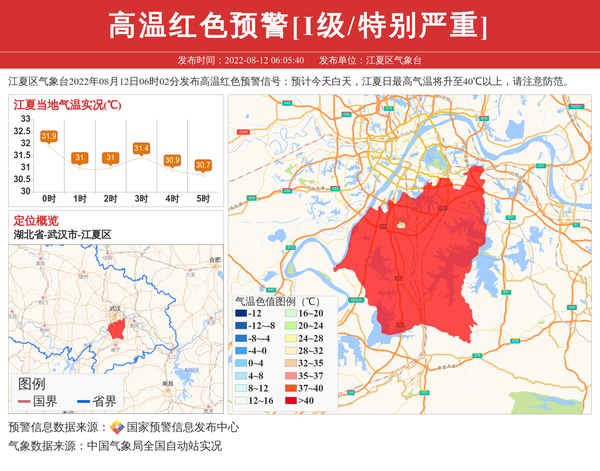 江夏区气象台2022年08月12日06时02分发布高温红色预警信号:预计今天白天,江夏日最高气温将升至40℃以上,请注意防范。 信息来源:国家预警信息发布中心; 发布单位:江夏区气象台。
