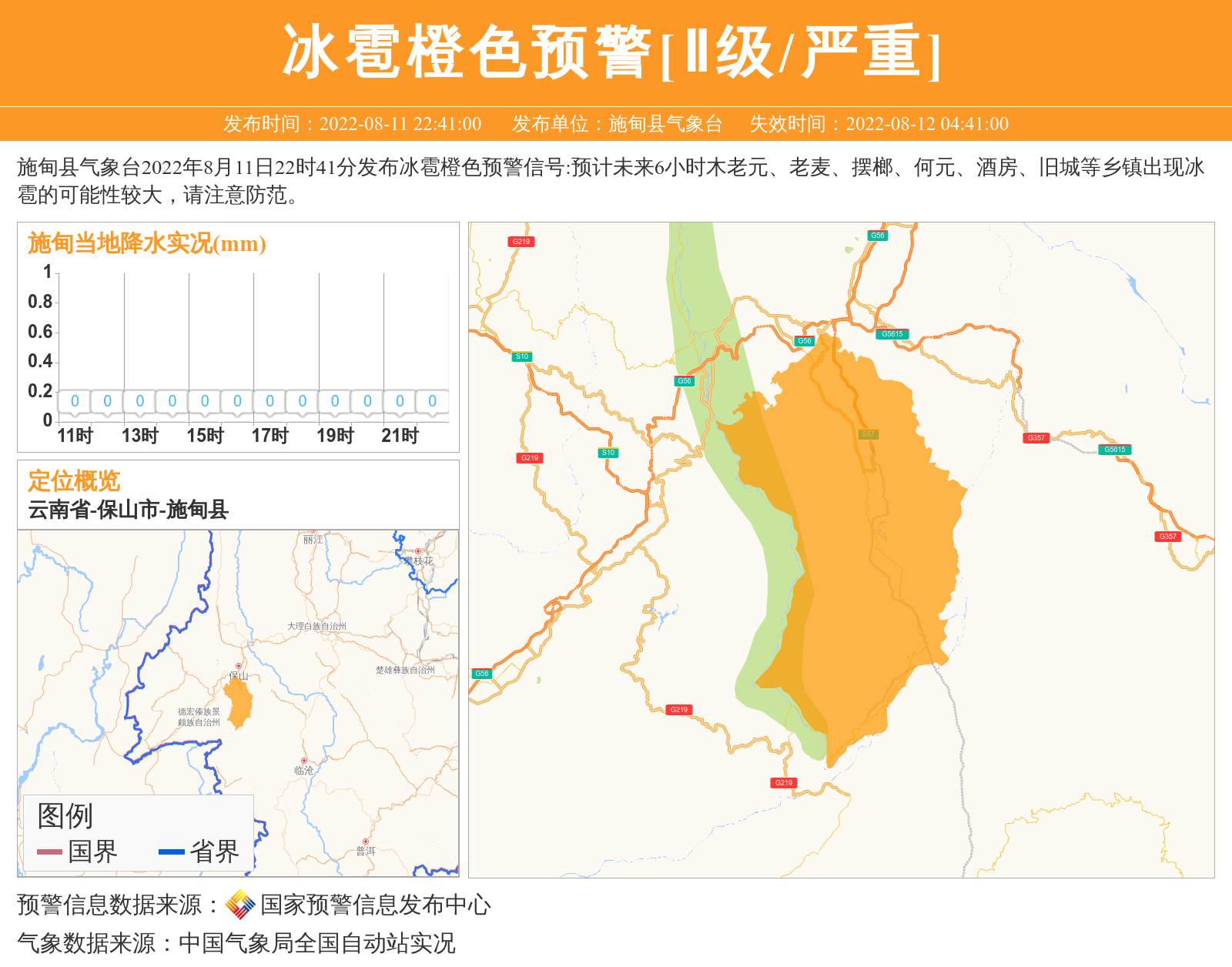 施甸县气象台2022年8月11日22时41分发布冰雹橙色预警信号:预计未来6小时木老元、老麦、摆榔、何元、酒房、旧城等乡镇出现冰雹的可能性较大,请注意防范。 信息来源:国家预警信息发布中心; 发布单位:施甸县气象台。