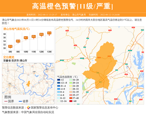 潜山市气象台2022年08月11日13时24分继续发布高温橙色预警信号。24小时内我市大部分地区最高气温仍将达到37℃以上。请注意防范! 信息来源:国家预警信息发布中心; 发布单位:潜山市气象局。
