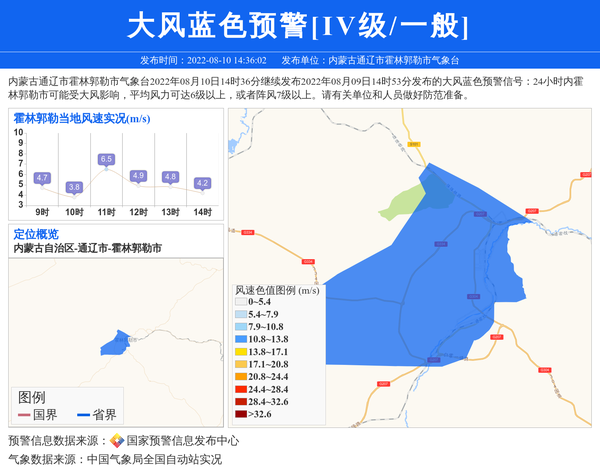 内蒙古通辽市霍林郭勒市气象台2022年08月10日14时36分继续发布2022年08月09日14时53分发布的大风蓝色预警信号:24小时内霍林郭勒市可能受大风影响,平均风力可达6级以上,或者阵风7级以上。请有关单位和人员做好防范准备。 信息来源:国家预警信息发布中心; 发布单位:内蒙古通辽市霍林郭勒市气象台。
