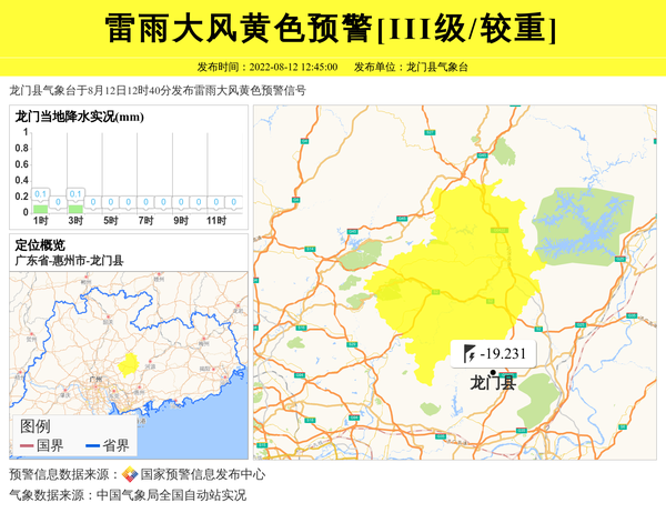 龙门县气象台于8月12日12时40分发布雷雨大风黄色预警信号 信息来源:国家预警信息发布中心; 发布单位:龙门县气象台。