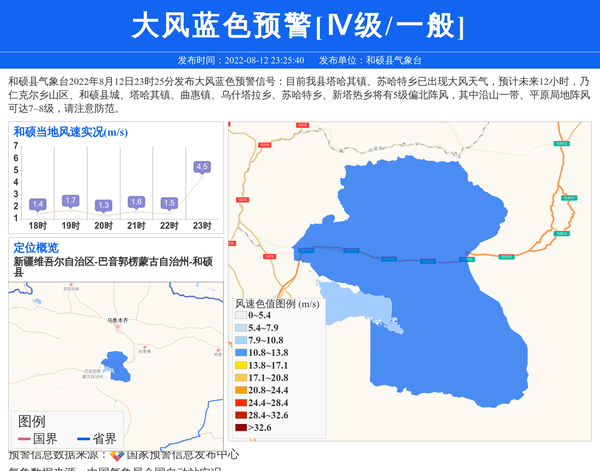 和硕县气象台2022年8月12日23时25分发布大风蓝色预警信号:目前我县塔哈其镇、苏哈特乡已出现大风天气,预计未来12小时,乃仁克尔乡山区、和硕县城、塔哈其镇、曲惠镇、乌什塔拉乡、苏哈特乡、新塔热乡将有5级偏北阵风,其中沿山一带、平原局地阵风可达7~8级,请注意防范。 信息来源:国家预警信息发布中心; 发布单位:和硕县气象台。