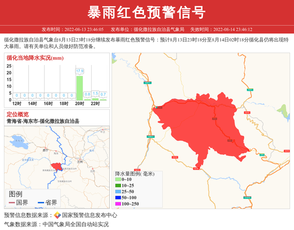 循化撒拉族自治县气象台8月13日23时18分继续发布暴雨红色预警信号:预计8月13日23时18分至8月14日02时18分循化县仍将出现特大暴雨。请有关单位和人员做好防范准备。 信息来源:国家预警信息发布中心; 发布单位:循化撒拉族自治县气象局。