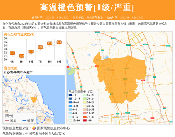 兴化市气象台2022年08月13日09时26分继续发布高温橙色预警信号:预计今天白天我市所有乡镇(街道)的最高气温将达39℃左右,市应急局(市减灾办)、市气象局联合提醒注意防范。 信息来源:国家预警信息发布中心; 发布单位:兴化市气象台。