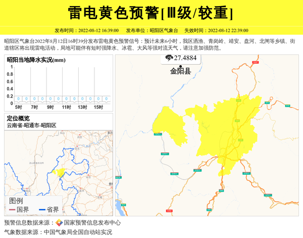 昭阳区气象台2022年8月12日16时39分发布雷电黄色预警信号:预计未来6小时,我区洒渔、青岗岭、靖安、盘河、北闸等乡镇、街道辖区将出现雷电活动,局地可能伴有短时强降水、冰雹、大风等强对流天气,请注意加强防范。 信息来源:国家预警信息发布中心; 发布单位:昭阳区气象台。