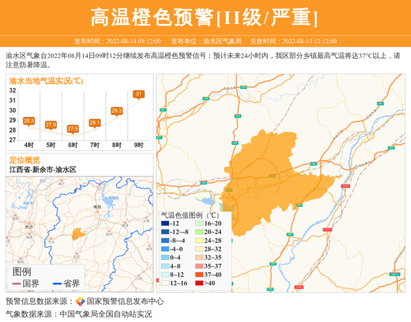 渝水区气象台2022年08月14日09时12分继续发布高温橙色预警信号:预计未来24小时内,我区部分乡镇最高气温将达37°C以上,请注意防暑降温。 信息来源:国家预警信息发布中心; 发布单位:渝水区气象局。