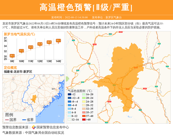 龙岩市新罗区气象台2022年08月13日14时38分继续发布高温橙色预警信号:预计未来24小时我区部分镇(街)最高气温可达35-37℃,局部超过38℃。请有关单位和人员注意做好防暑降温工作,户外或者高温条件下的作业人员应当采取必要的防护措施。 信息来源:国家预警信息发布中心; 发布单位:新罗区气象台。