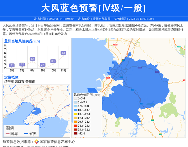 大风蓝色预警信号:预计14日午后到夜间,盖州市偏南风5到6级、阵风8级,渤海北部海域偏南风6到7级、阵风9级,请做好防风工作,妥善安置室外物品,尽量避免户外作业、活动,相关水域水上作业和过往船舶采取积极的应对措施,如回港避风或者绕道航行等。盖州市气象台2022年8月14日11时48分发布 信息来源:国家预警信息发布中心; 发布单位:盖州市气象局。