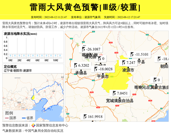 雷雨大风黄色预警信号:预计未来4到6小时,凌源市将出现较强雷雨大风天气,阵风风力可达9级以上,同时可能伴有冰雹、短时强降水等强对流天气,请做好防风、防雷工作,减少户外活动。凌源市气象台2022年8月12日11时16分发布。 信息来源:国家预警信息发布中心; 发布单位:凌源市气象局。