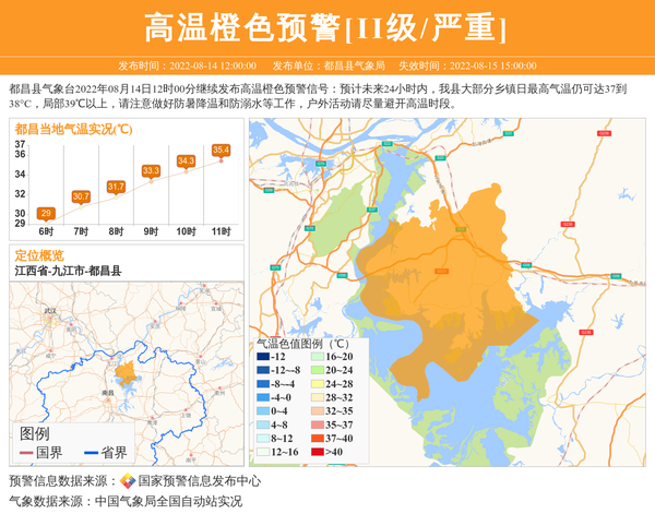 都昌县气象台2022年08月14日12时00分继续发布高温橙色预警信号:预计未来24小时内,我县大部分乡镇日最高气温仍可达37到38°C,局部39℃以上,请注意做好防暑降温和防溺水等工作,户外活动请尽量避开高温时段。 信息来源:国家预警信息发布中心; 发布单位:都昌县气象局。