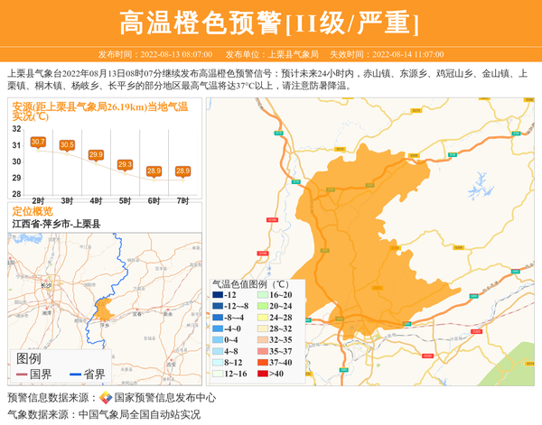 上栗县气象台2022年08月13日08时07分继续发布高温橙色预警信号:预计未来24小时内,赤山镇、东源乡、鸡冠山乡、金山镇、上栗镇、桐木镇、杨岐乡、长平乡的部分地区最高气温将达37°C以上,请注意防暑降温。 信息来源:国家预警信息发布中心; 发布单位:上栗县气象局。