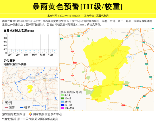 嵩县气象台2022年8月12日16时22分发布暴雨黄色预警信号:预计6小时内我县木植街、车村、白河、黄庄、九皋、纸房等乡镇降雨量将达50毫米以上,且降雨可能持续。目前白河镇瓦房村降雨量37.7mm,请注意防范。 信息来源:国家预警信息发布中心; 发布单位:嵩县气象局。