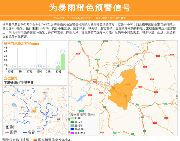 榆中县气象台2022年08月14日00时22分将暴雨黄色预警信号升级为暴雨橙色预警信号:过去一小时,我县榆中国家基准气候站降水量已达41.3毫米。预计未来3小时内,我县小康营乡、清水驿乡、城关镇、夏官营镇、金崖镇降水仍将持续,累积雨量将达50毫米以上,局地小时雨强将超过40毫米,并伴有雷暴、阵性大风。请注意防范强降水可能引发的中小河流洪水、城乡积涝、山洪、滑坡和泥石流等次生灾害。 信息来源:国家预警信息发布中心; 发布单位:榆中县气象台。