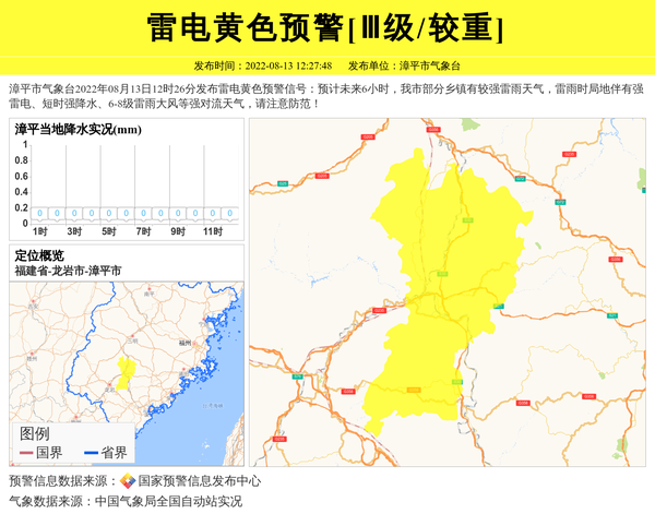 漳平市气象台2022年08月13日12时26分发布雷电黄色预警信号:预计未来6小时,我市部分乡镇有较强雷雨天气,雷雨时局地伴有强雷电、短时强降水、6-8级雷雨大风等强对流天气,请注意防范! 信息来源:国家预警信息发布中心; 发布单位:漳平市气象台。