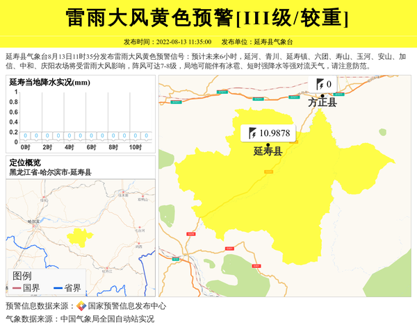 延寿县气象台8月13日11时35分发布雷雨大风黄色预警信号:预计未来6小时,延河、青川、延寿镇、六团、寿山、玉河、安山、加信、中和、庆阳农场将受雷雨大风影响,阵风可达7-8级,局地可能伴有冰雹、短时强降水等强对流天气,请注意防范。 信息来源:国家预警信息发布中心; 发布单位:延寿县气象台。