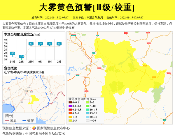 大雾黄色预警信号:目前本溪县出现能见度小于500米的大雾天气,并将持续3到4小时,请驾驶员严格控制行车速度,保持车距,必要时靠边停车。本溪县气象台2022年8月15日3时4分发布 信息来源:国家预警信息发布中心; 发布单位:本溪县气象局。