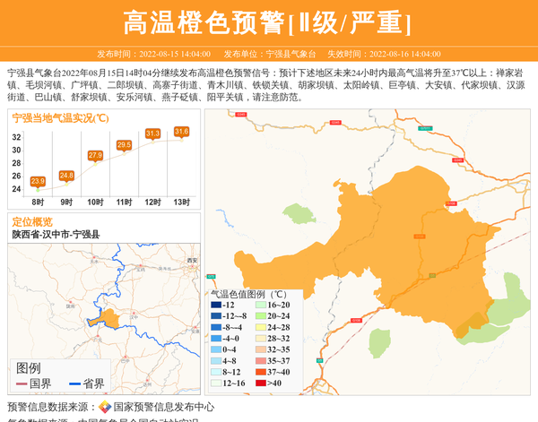 宁强县气象台2022年08月15日14时04分继续发布高温橙色预警信号:预计下述地区未来24小时内最高气温将升至37℃以上:禅家岩镇、毛坝河镇、广坪镇、二郎坝镇、高寨子街道、青木川镇、铁锁关镇、胡家坝镇、太阳岭镇、巨亭镇、大安镇、代家坝镇、汉源街道、巴山镇、舒家坝镇、安乐河镇、燕子砭镇、阳平关镇,请注意防范。 信息来源:国家预警信息发布中心; 发布单位:宁强县气象台。