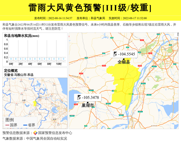 和县气象台2022年08月16日11时52分发布雷雨大风黄色预警信号。未来6小时内我县善厚、石杨等乡镇将出现7级左右雷雨大风,并伴有短时强降水等强对流天气,请注意防范! 信息来源:国家预警信息发布中心; 发布单位:和县气象局。