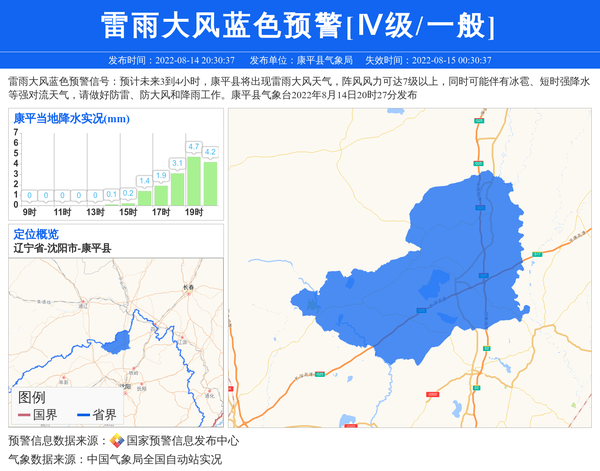 雷雨大风蓝色预警信号:预计未来3到4小时,康平县将出现雷雨大风天气,阵风风力可达7级以上,同时可能伴有冰雹、短时强降水等强对流天气,请做好防雷、防大风和降雨工作。康平县气象台2022年8月14日20时27分发布 信息来源:国家预警信息发布中心; 发布单位:康平县气象局。