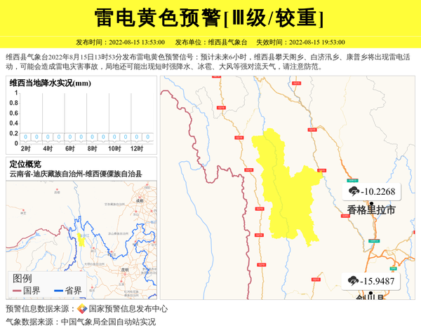 维西县气象台2022年8月15日13时53分发布雷电黄色预警信号:预计未来6小时,维西县攀天阁乡、白济汛乡、康普乡将出现雷电活动,可能会造成雷电灾害事故,局地还可能出现短时强降水、冰雹、大风等强对流天气,请注意防范。 信息来源:国家预警信息发布中心; 发布单位:维西县气象台。