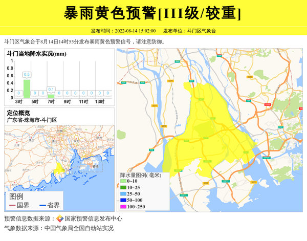 斗门区气象台于8月14日14时55分发布暴雨黄色预警信号,请注意防御。 信息来源:国家预警信息发布中心; 发布单位:斗门区气象台。