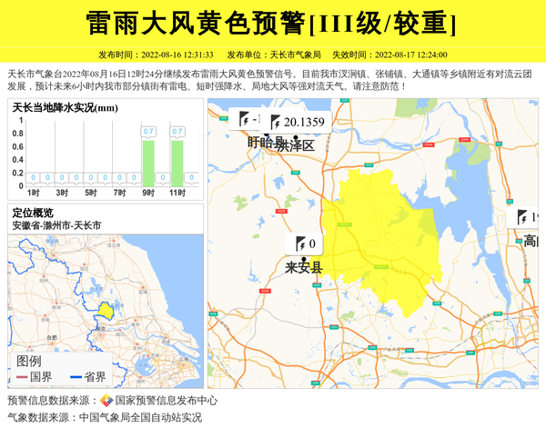 天长市气象台2022年08月16日12时24分继续发布雷雨大风黄色预警信号。目前我市汊涧镇、张铺镇、大通镇等乡镇附近有对流云团发展,预计未来6小时内我市部分镇街有雷电、短时强降水、局地大风等强对流天气。请注意防范! 信息来源:国家预警信息发布中心; 发布单位:天长市气象局。