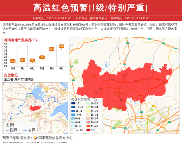 德清县气象台发布高温红色预警[Ⅰ级/特别严重]