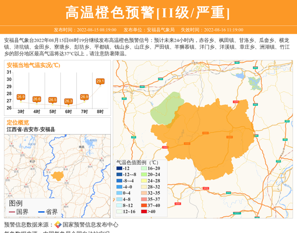 安福县气象台2022年08月15日08时19分继续发布高温橙色预警信号:预计未来24小时内,赤谷乡、枫田镇、甘洛乡、瓜畲乡、横龙镇、浒坑镇、金田乡、寮塘乡、彭坊乡、平都镇、钱山乡、山庄乡、严田镇、羊狮慕镇、洋门乡、洋溪镇、章庄乡、洲湖镇、竹江乡的部分地区最高气温将达37°C以上,请注意防暑降温。 信息来源:国家预警信息发布中心; 发布单位:安福县气象局。