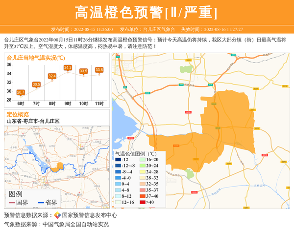 台儿庄区气象台2022年08月15日11时26分继续发布高温橙色预警信号:预计今天高温仍将持续,我区大部分镇(街)日最高气温将升至37℃以上。空气湿度大,体感温度高,闷热易中暑,请注意防范! 信息来源:国家预警信息发布中心; 发布单位:台儿庄区气象台。