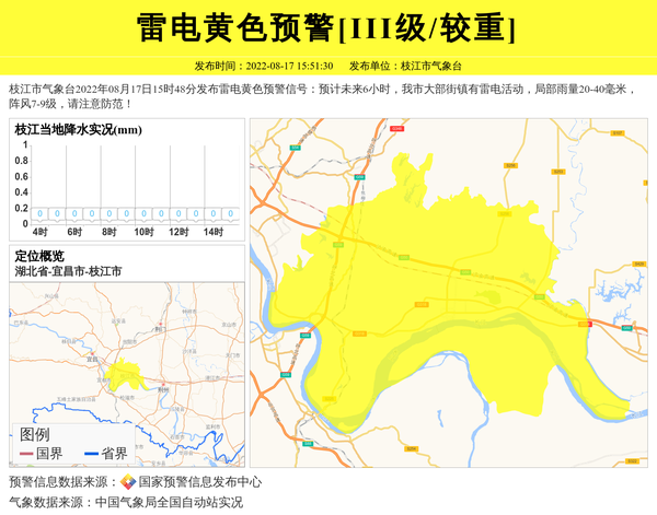枝江市气象台2022年08月17日15时48分发布雷电黄色预警信号:预计未来6小时,我市大部街镇有雷电活动,局部雨量20-40毫米,阵风7-9级,请注意防范! 信息来源:国家预警信息发布中心; 发布单位:枝江市气象台。