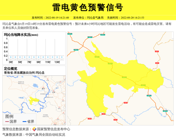 玛沁县气象台8月19日14时25分发布雷电黄色预警信号:预计未来6小时玛沁地区可能发生雷电活动,有可能会造成雷电灾害。请有关单位和人员做好防范准备。 信息来源:国家预警信息发布中心; 发布单位:玛沁县气象局。