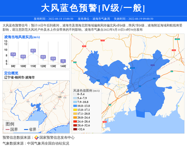 大风蓝色预警信号:预计18日午后到夜间,凌海市及渤海北部海域偏南风转偏北风4到6级,阵风7到8级,凌海附近海域和航线将受影响,请注意防范大风对户外及水上作业带来的不利影响。凌海市气象台2022年8月18日14时56分发布 信息来源:国家预警信息发布中心; 发布单位:凌海市气象局。