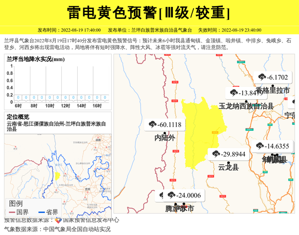 兰坪县气象台2022年8月19日17时40分发布雷电黄色预警信号:预计未来6小时我县通甸镇、金顶镇、啦井镇、中排乡、兔峨乡、石登乡、河西乡将出现雷电活动,局地将伴有短时强降水、阵性大风、冰雹等强对流天气,请注意防范。 信息来源:国家预警信息发布中心; 发布单位:兰坪白族普米族自治县气象台。