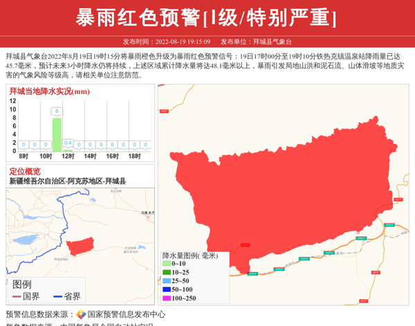 拜城县气象台2022年8月19日19时15分将暴雨橙色升级为暴雨红色预警信号:19日17时00分至19时10分铁热克镇温泉站降雨量已达45.7毫米,预计未来3小时降水仍将持续,上述区域累计降水量将达48.1毫米以上,暴雨引发局地山洪和泥石流、山体滑坡等地质灾害的气象风险等级高,请相关单位注意防范。 信息来源:国家预警信息发布中心; 发布单位:拜城县气象台。