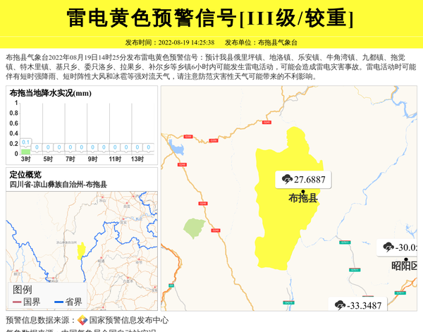 布拖县气象台2022年08月19日14时25分发布雷电黄色预警信号:预计我县俄里坪镇、地洛镇、乐安镇、牛角湾镇、九都镇、拖觉镇、特木里镇、基只乡、委只洛乡、拉果乡、补尔乡等乡镇6小时内可能发生雷电活动,可能会造成雷电灾害事故。雷电活动时可能伴有短时强降雨、短时阵性大风和冰雹等强对流天气,请注意防范灾害性天气可能带来的不利影响。 信息来源:国家预警信息发布中心; 发布单位:布拖县气象台。