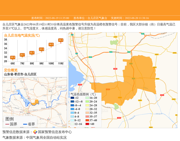 台儿庄区气象台2022年08月19日11时35分将高温黄色预警信号升级为高温橙色预警信号:目前,我区大部分镇(街)日最高气温已升至37℃以上。空气湿度大,体感温度高,闷热易中暑,请注意防范! 信息来源:国家预警信息发布中心; 发布单位:台儿庄区气象台。