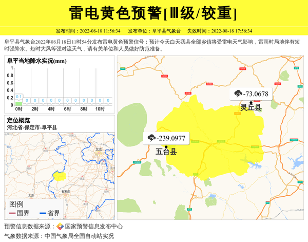 阜平县气象台2022年08月18日11时54分发布雷电黄色预警信号:预计今天白天我县全部乡镇将受雷电天气影响,雷雨时局地伴有短时强降水、短时大风等强对流天气,请有关单位和人员做好防范准备。 信息来源:国家预警信息发布中心; 发布单位:阜平县气象台。