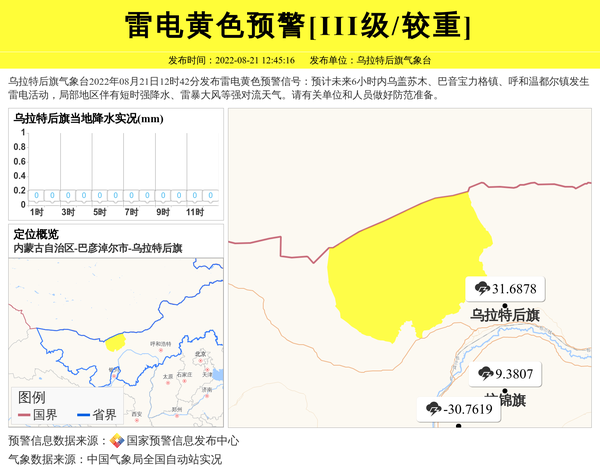 乌拉特后旗气象台2022年08月21日12时42分发布雷电黄色预警信号:预计未来6小时内乌盖苏木、巴音宝力格镇、呼和温都尔镇发生雷电活动,局部地区伴有短时强降水、雷暴大风等强对流天气。请有关单位和人员做好防范准备。 信息来源:国家预警信息发布中心; 发布单位:乌拉特后旗气象台。