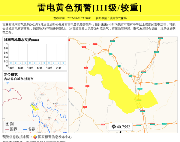 吉林省洮南市气象局2022年8月21日23时00分发布雷电黄色预警信号:预计未来6小时内我市可能有中等以上强度的雷电活动,可能会造成雷电灾害事故,局部地方伴有短时强降水、冰雹或雷暴大风等强对流天气,市应急管理局、市气象局联合提醒:注意做好防范工作。 信息来源:国家预警信息发布中心; 发布单位:洮南市气象局。