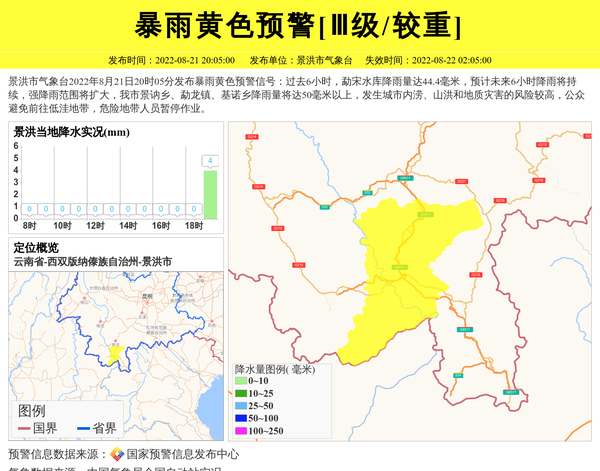 景洪市气象台2022年8月21日20时05分发布暴雨黄色预警信号:过去6小时,勐宋水库降雨量达44.4毫米,预计未来6小时降雨将持续,强降雨范围将扩大,我市景讷乡、勐龙镇、基诺乡降雨量将达50毫米以上,发生城市内涝、山洪和地质灾害的风险较高,公众避免前往低洼地带,危险地带人员暂停作业。 信息来源:国家预警信息发布中心; 发布单位:景洪市气象台。