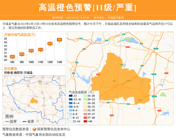 方城县气象台2022年8月22日13时28分发布高温橙色预警信号:预计今天下午,方城县城区及所辖乡镇和街道最高气温将升至37℃以上,请注意做好防暑降温工作。 信息来源:国家预警信息发布中心; 发布单位:方城县气象局。